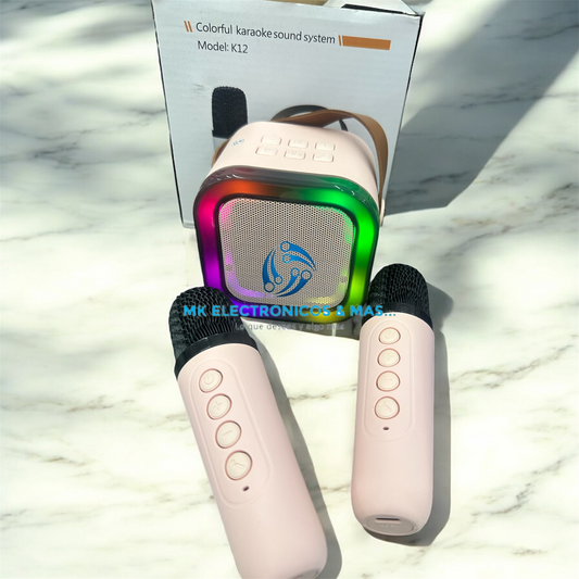 Mini Bocina Bluetooth luces RGB K12 Karaoke con 2 Micrófonos inalámbricos recargables para niños y adultos, para todos los teléfonos inteligentes, cumpleaños, familia, fiesta